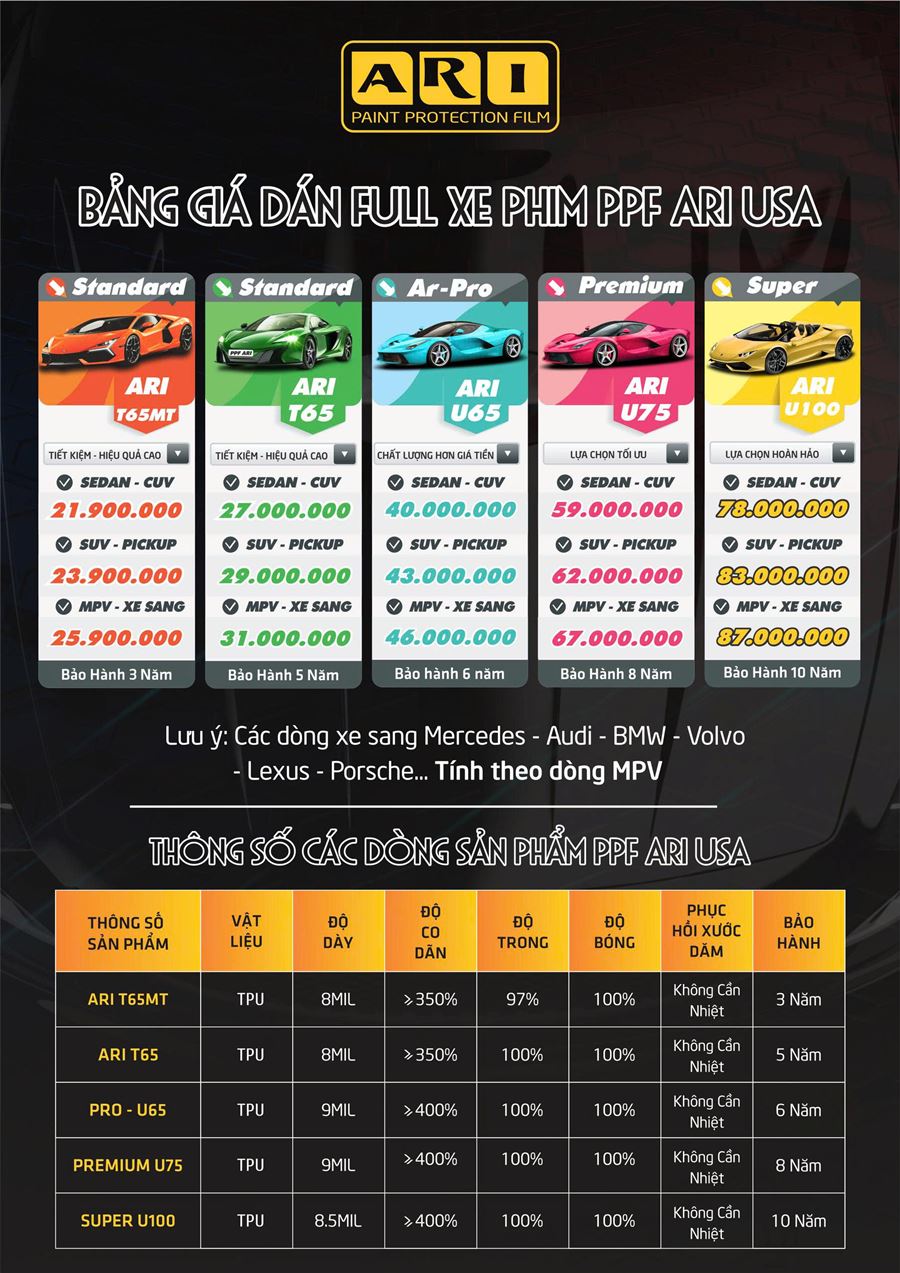 Mức giá này phụ thuộc vào dòng sản phẩm phim ARI cụ thể mà khách hàng lựa chọn (dòng phim tiêu chuẩn, dòng phim cao cấp hay dòng phim có độ dày đặc biệt). Đây là một khoản đầu tư xứng tầm cho một chiếc SUV hạng sang, giúp duy trì tình trạng hoàn hảo của xe trong nhiều năm, giảm thiểu tối đa các chi phí sửa chữa ngoại thất phát sinh do tác động môi trường.